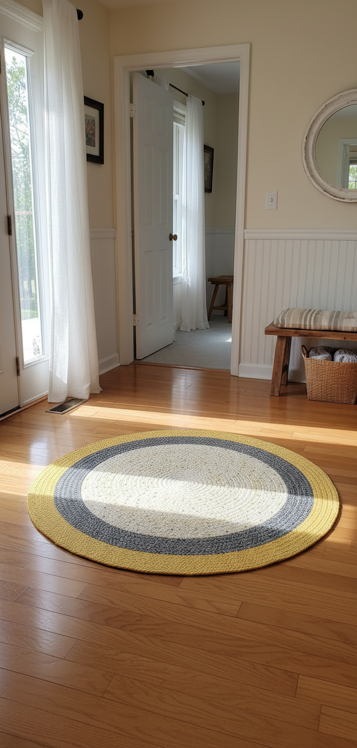 Bee-utiful round golden and white round rug (above). Honeycomb designs for your "honey". This is a 60 to 80 strip rug.
